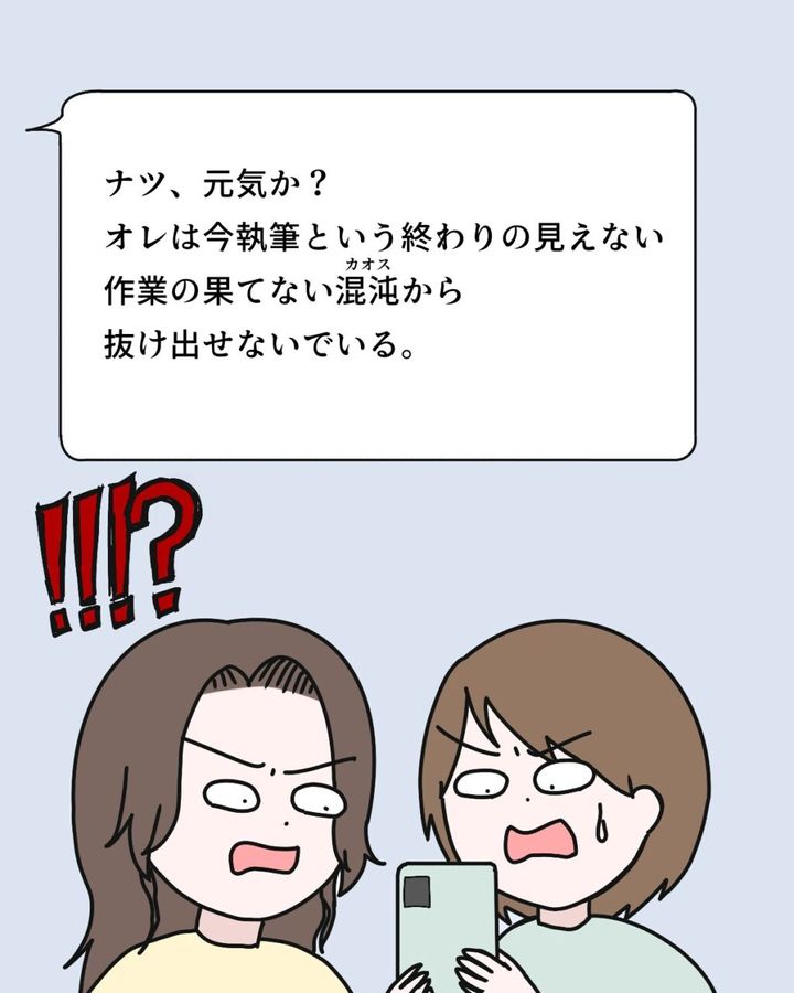 離婚から1ヶ月経ったある日、突然元夫フミヤから届いたメッセージ。恐る恐る開いてみると・・ポエムのような内容がずらり。『ナツ、元気か?オレは今執筆という終わりの見えない作業の果てない混沌から抜け出せないでいる』出だしのこの一文だけで私とカナちゃんはギョッとしましたが、まだまだメッセージは続きます。
