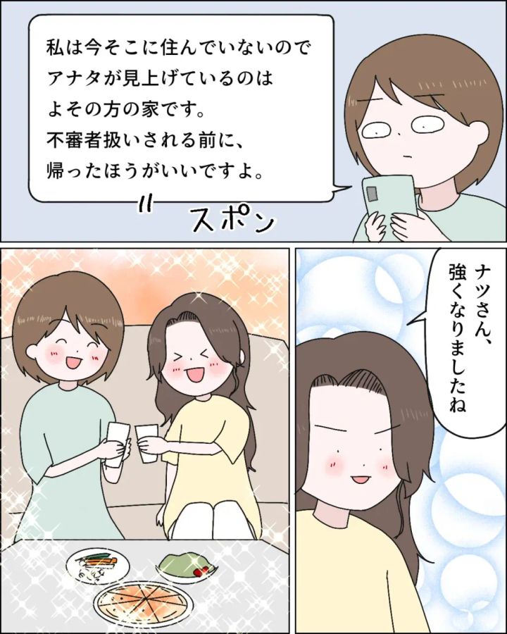『私は今そこに住んでいないのでアナタが見上げているのはよその方の家です。不審者扱いされる前に、帰ったほうがいいですよ』そう淡々とメッセージを送って私はスマホを置きました。そんな私を見てカナちゃんが「ナツさん、強くなりましたね」と微笑みました。私がフミヤのことで一喜一憂することはもう二度とないでしょう。私は前を向いて新しい人生を楽しみます!