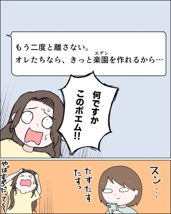 『もう二度と離さない。オレたちなら、きっと楽園を作れるから・・』一方的な想いを綴ったフミヤの重たいメッセージに「何ですかこのポエム!!やばすぎだって~」とドン引きするカナちゃん。同じくドン引きはしているものの、私はスンとして無表情でメッセージを打ち始めました。