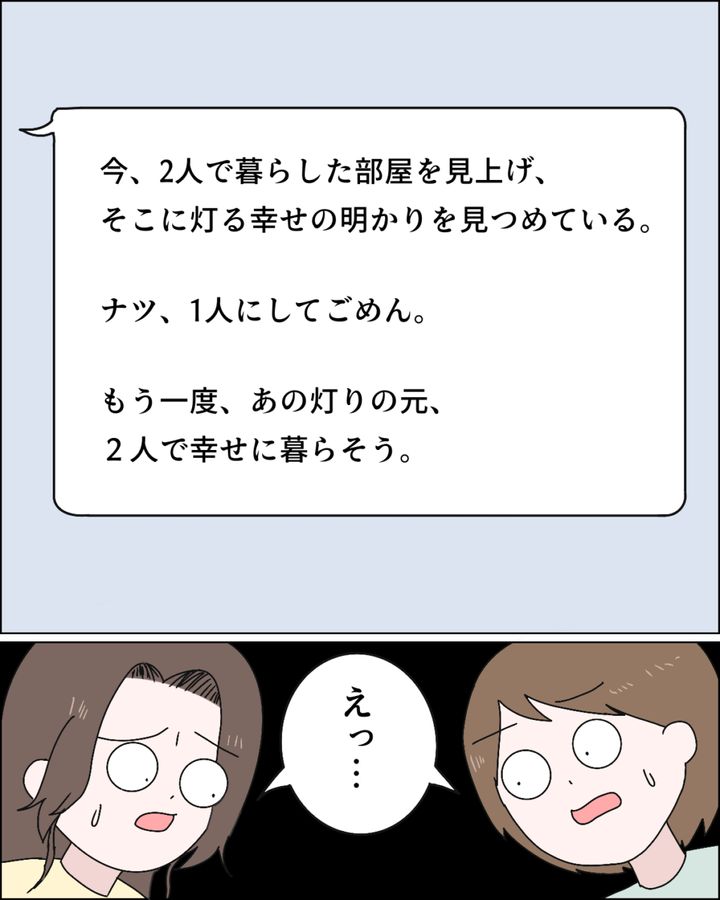 さらに続くメッセージ。『今、2人で暮らした部屋を見上げ、そこに灯る幸せの明かりを見つめている。ナツ、1人にしてごめん。もう一度、あの灯りの元、2人で幸せに暮らそう』これを読んで私はカナちゃんと「えっ・・」と顔を見合わせました。