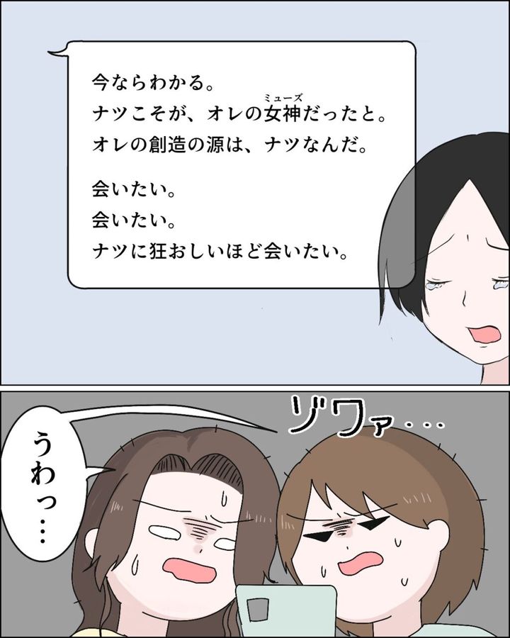 『今ならわかる。ナツこそが、オレの女神だったと。オレの創造の源は、ナツだったんだ。会いたい。会いたい。ナツに狂おしいほど会いたい』可哀想な自分に酔いしれるフミヤのメッセージに私達は思わず「うわっ」と同時に声が出てゾワッと鳥肌が立ちました。