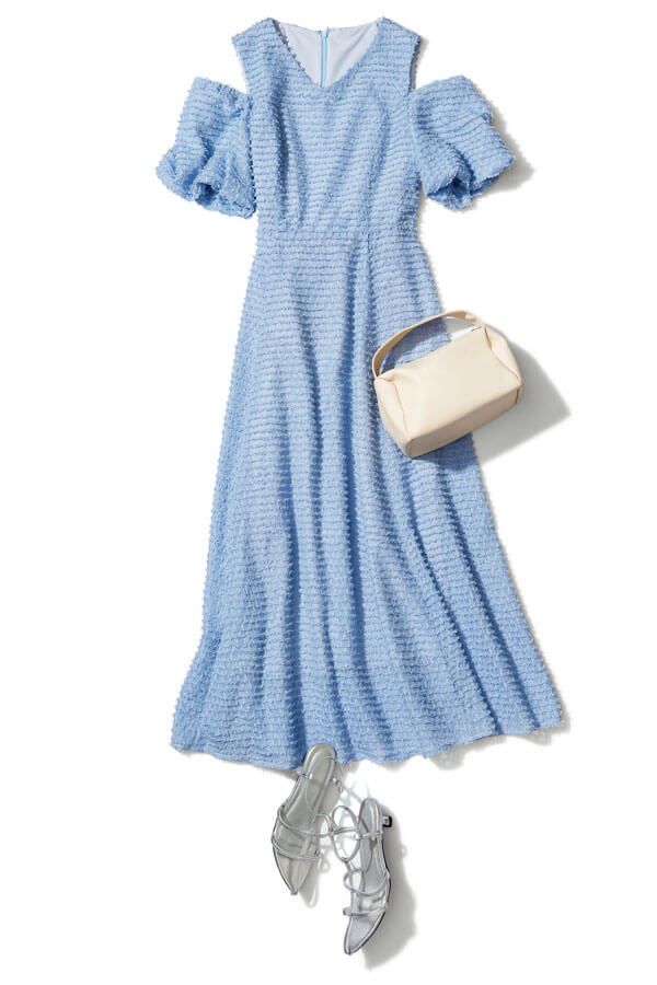 令嬢ライクな生地の質感が、オフショルを品よく演出。白のバッグとシルバーのサンダルが、ライトブルーワンピのさわやかさを引き立てるアクセントに。
