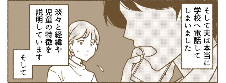 本当に学校に電話してしまった夫。昨日バスのなかで「キモい」と言われたこと、これまでもA小の児童が荷物を置いて他の乗客に席を譲っていなかったことなどを淡々と伝えます。その子の特徴や、どのバスに乗っているかも細かく話していました。
