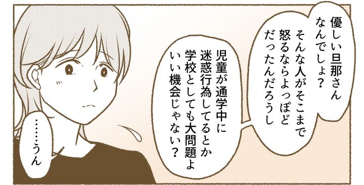 私は夫の「(キモいと言った子と保護者に)謝罪に来てほしい」という言葉に驚きましたが、ママ友と話すうちに夫の行動はやりすぎではないのかもしれないと思い始めます。