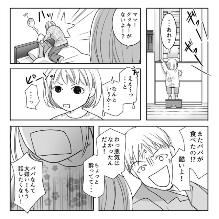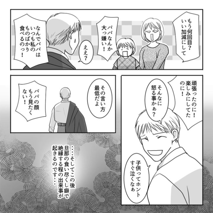 衝撃のエピソードを漫画化!今回は、娘のおやつまで食べ尽くす厄介な旦那のお話をご紹介します。「娘のご褒美だから食べないで」と伝えているにも関わらずお腹が空いたら全て食べてしまう旦那。娘はその度泣いているのに、その姿を見て父親失格な最低発言を繰り出し・・・。