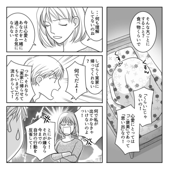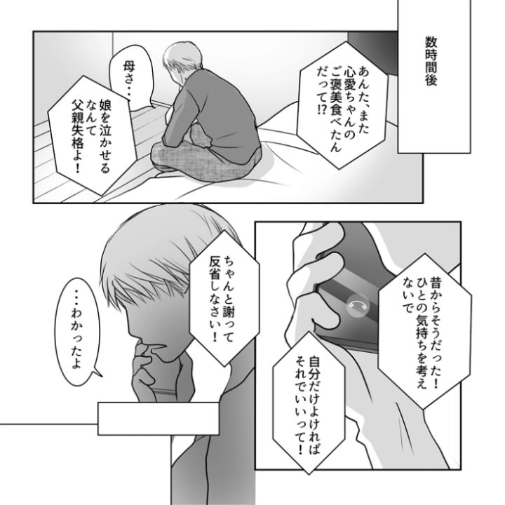 娘だけでなく、母親、妻からの総スカンをくらいさすがに反省をした旦那。娘の優しさに救われたことに感謝して二度と同じことをしないと誓ったのでした。