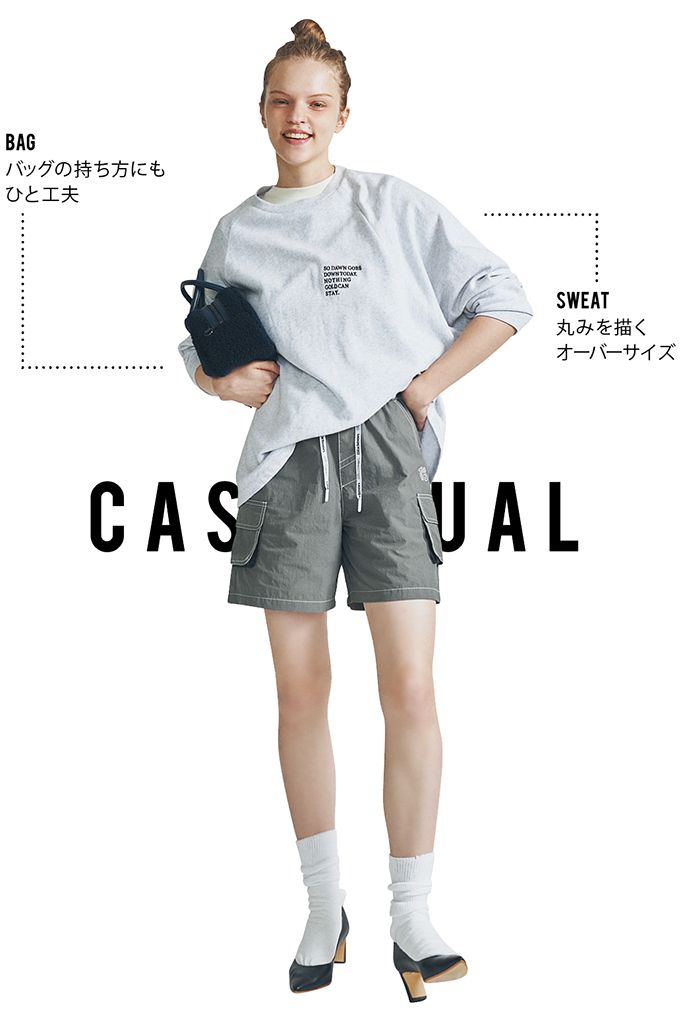 コントラストがつけやすい、ゆったりトップスとショートパンツの組み合わせ。ヒップラインが隠せる効果もアリ。
