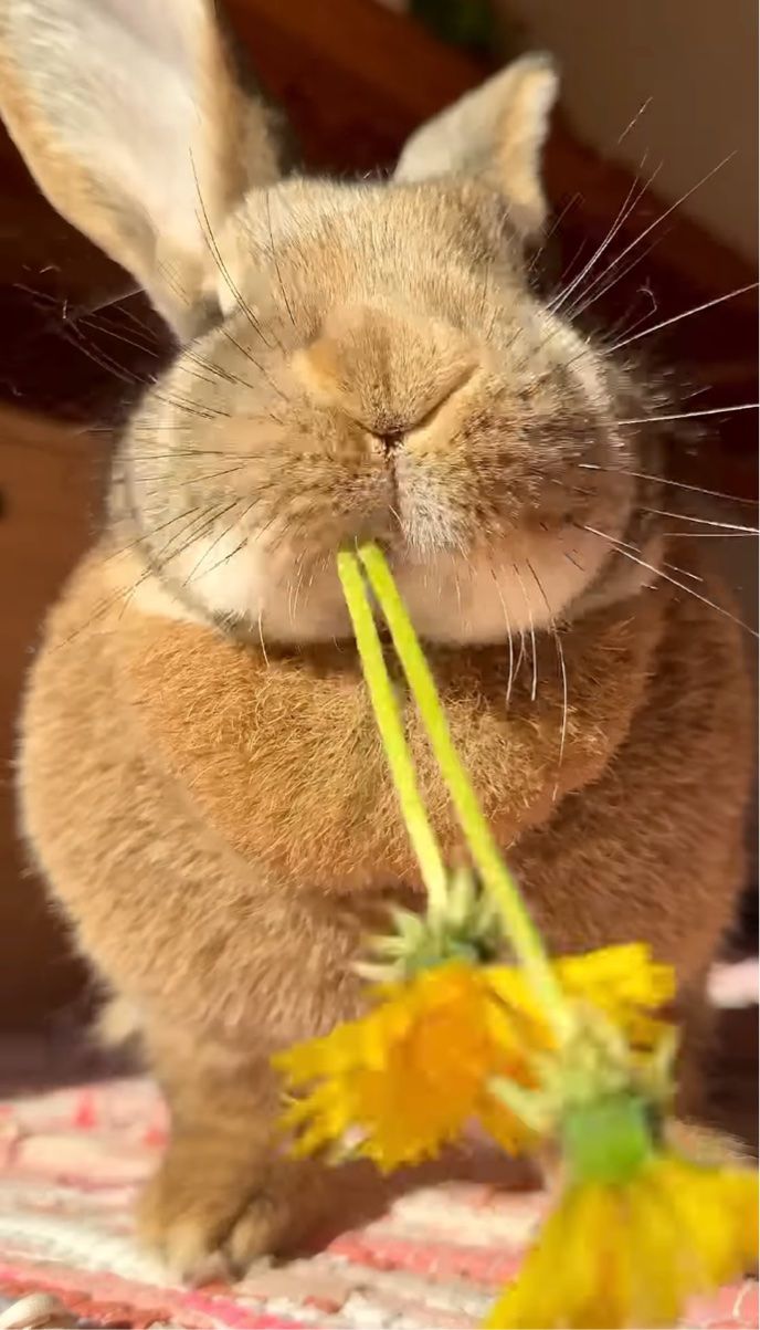 タンポポをもぐもぐ頬張るウサギ。 むっちりとしたほっぺが小刻みに動くその姿はたまらなくかわいいですし、心地よい咀嚼音にはASMRのようです!