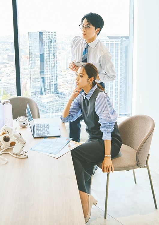 [璃佑君]シャツ¥4,389、タイ¥5,390、パンツ¥43,890(スーツ価格)/以上ユニバーサルランゲージ(スーツスクエア TOKYO GIN ZA店) メガネ¥41,800/イエローズプラス(コンティニュエ) ふくふくにゃんこ3WAYハンズフリーファン¥2,780/ハピンズ その他/スタイリスト私物