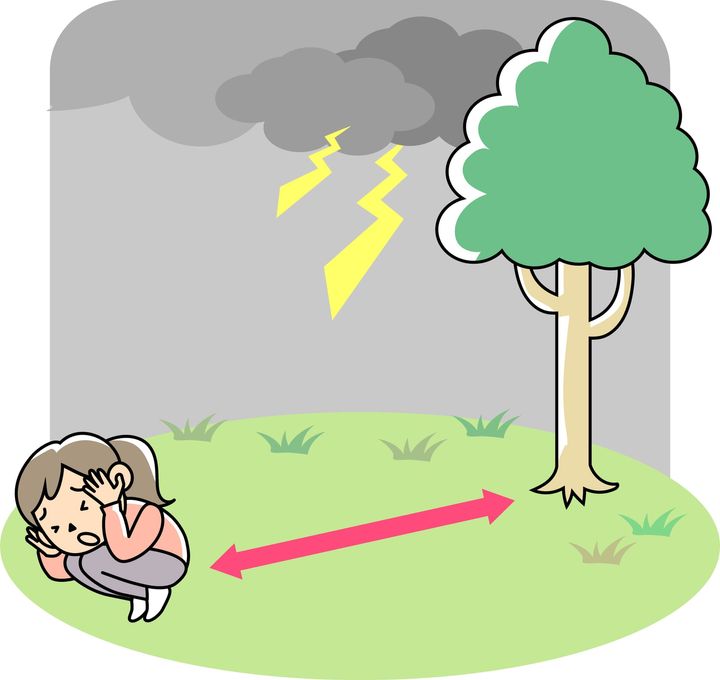 木には雷が落ちやすく、近づくのは危険です。木の下で雨宿りをしていて、木から落雷が飛び移る「側撃雷」により負傷する場合もあります。
