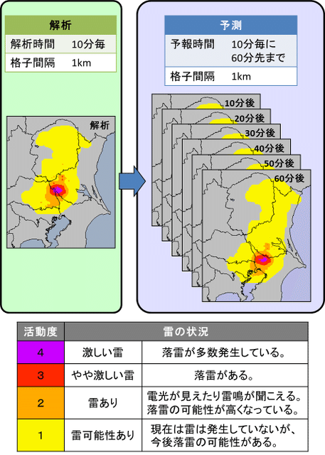 気象庁が運用する「雷ナウキャスト(雷活動度)」は、雷監視システムならびにレーダー観測などを元に、雷が発生する可能性や、発生している雷の激しさを、1km格子単位で解析しています。