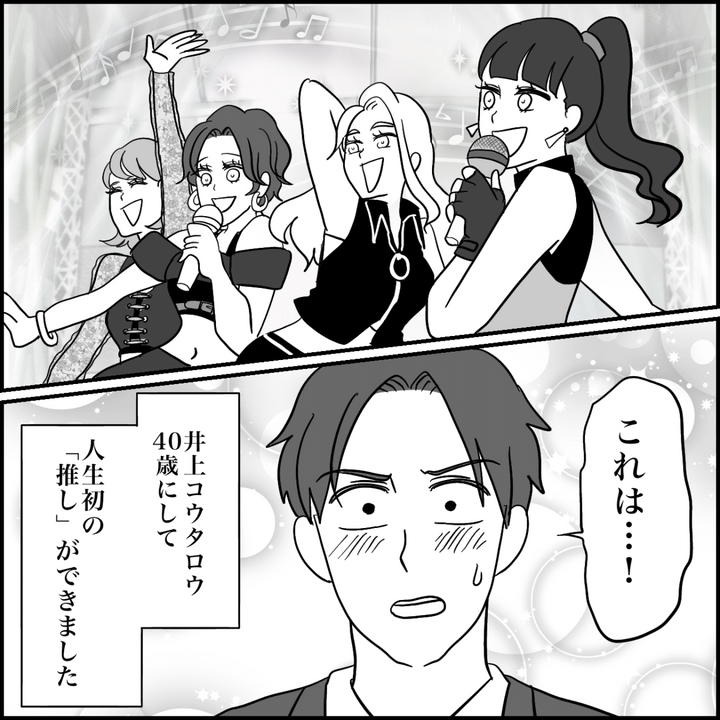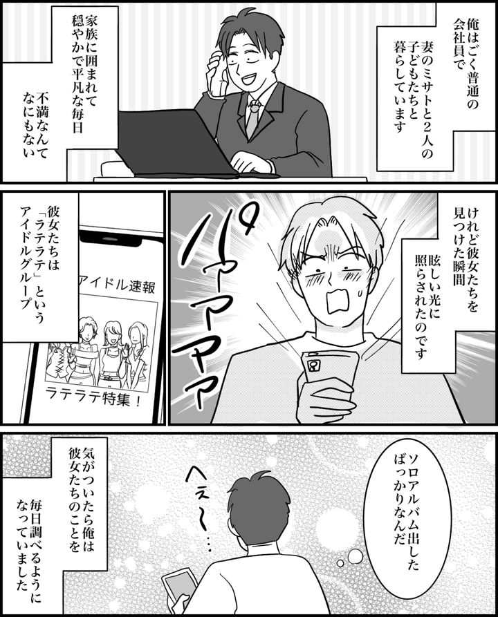 俺は井上コウタロウ(40歳)。妻のミサト(35歳)と2人の子どもたちとの4人家族です。穏やかな毎日ではありますが、これといった刺激もなく同じことを繰り返す生活を送っています。そんなある日、俺はいつものように動画アプリをダラダラと見ていました。何気なくスワイプしていると、突如表示されたアイドルグループの女の子たちに釘付けになったのです。この出会いは、久しぶりに俺の心を大きく動かしたのです……!