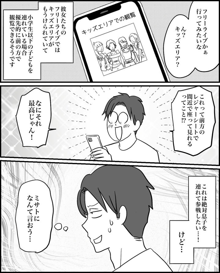 子どもと一緒なら前列のレジャーシートで、視界を遮るものなく座って見られる! それはぜひ息子を連れて参戦したい……! けれど俺はミサトに、推しができたことをまだ伝えられずにいます。どう打ち明けようか悩みます。
