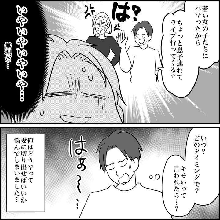 1人でライブに行くならまだしも、息子を連れてライブに行くとなればミサトに推しの存在を話さざるをえません。俺はどう切り出したらいいのかと悩んでしまったのでした。