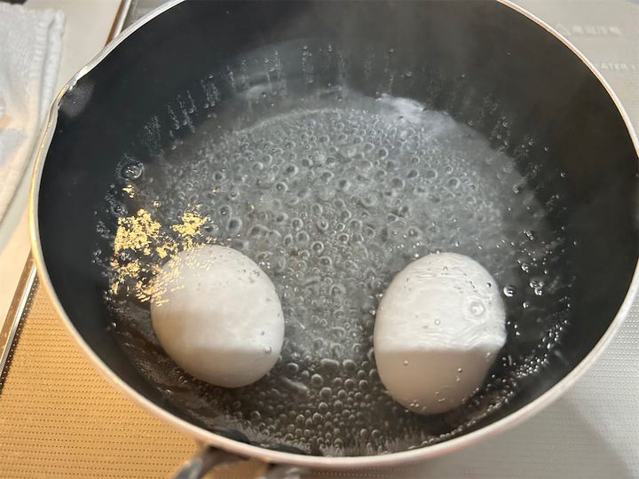 1.鍋に湯を沸かし、中火で卵を茹でます。