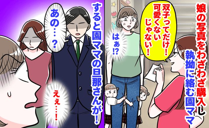 「双子ってだけ!可愛くない!」園で娘の写真を購入し執拗に絡むママ。園長に相談すると、旦那さんが!