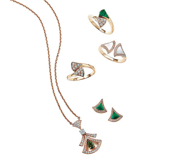 上から_「ディーヴァ ドリーム」リング[PG×マラカイト×DIA]¥451,000 同リング[PG×MOP×DIA]¥594,000 同リング[PG×DIA]¥643,500 同ピアス[PG×マラカイト×DIA]¥504,900 同ネックレス[PG×グリーントルマリン×DIA]¥1,210,000(すべてブルガリ/ブルガリ・ジャパン)