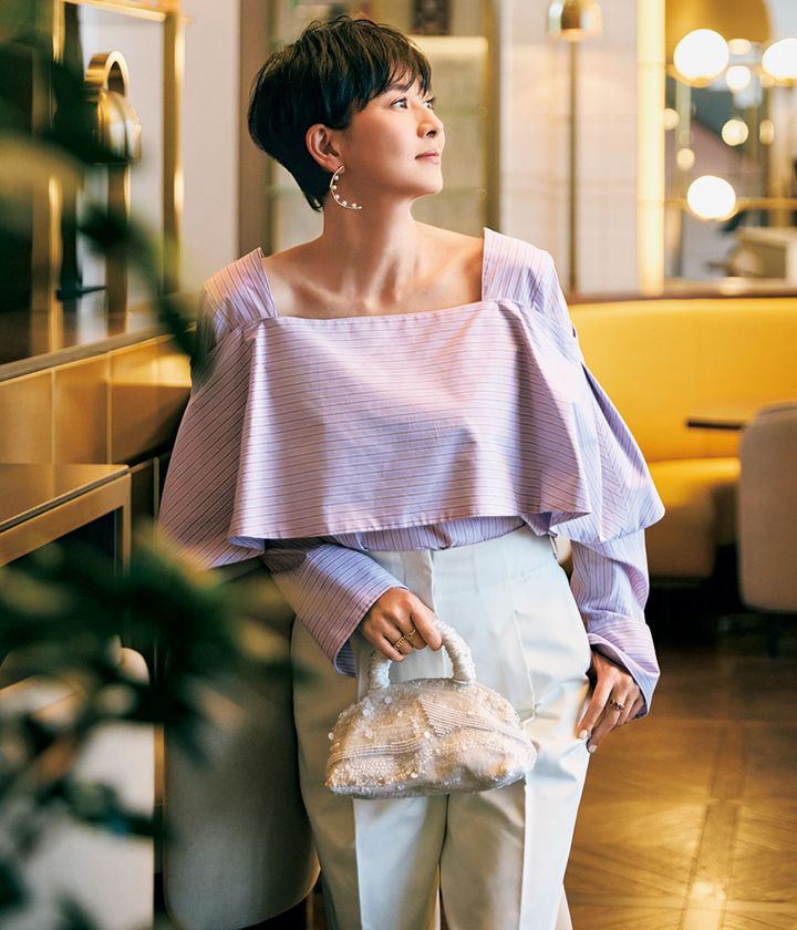 ストライプのもつノーブルな雰囲気が、大人の肌見せにちょうどいい。ストライプブラウス¥22,000(ノーブル/ノーブル 有楽町マルイ店)ワイドパンツ¥39,600(サードマガジン)バッグ¥58,300(マーレット/リトルリーグ インク)イヤリング¥77,000(カラットアー/イセタンサローネ東京)リング[右手中指]¥132,000リング[左手中指]¥134,200(ともにマリハ)リング[右手薬指]¥65,000(K E I R./ロードス)