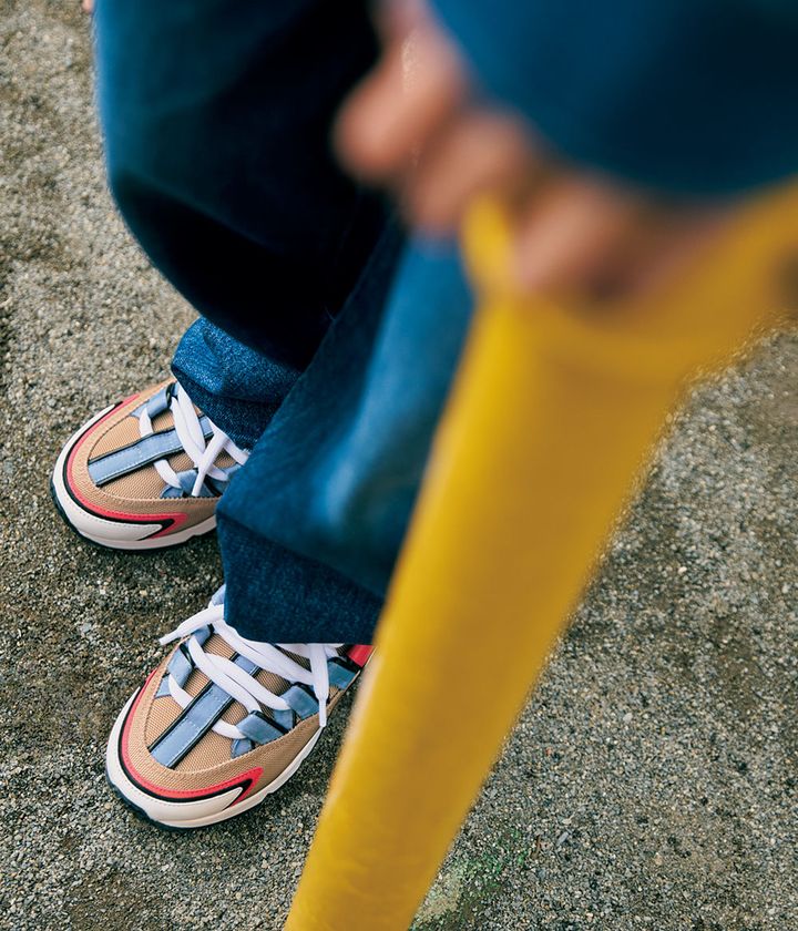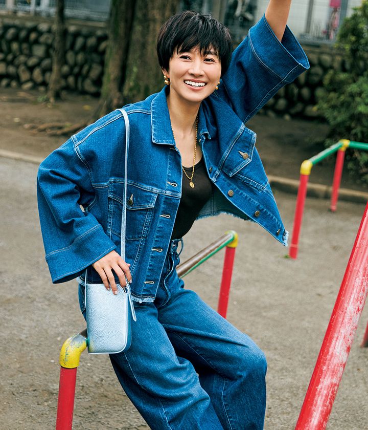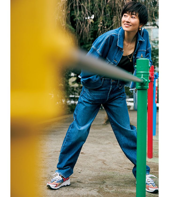 〝子どもと一緒に鬼ごっこをして、ブランコを押して駆け回ってどろんこになる公園。春休みは毎日のように行くので、カラフルなスニーカーやデニムonデニムでマンネリを解消したいです。〟