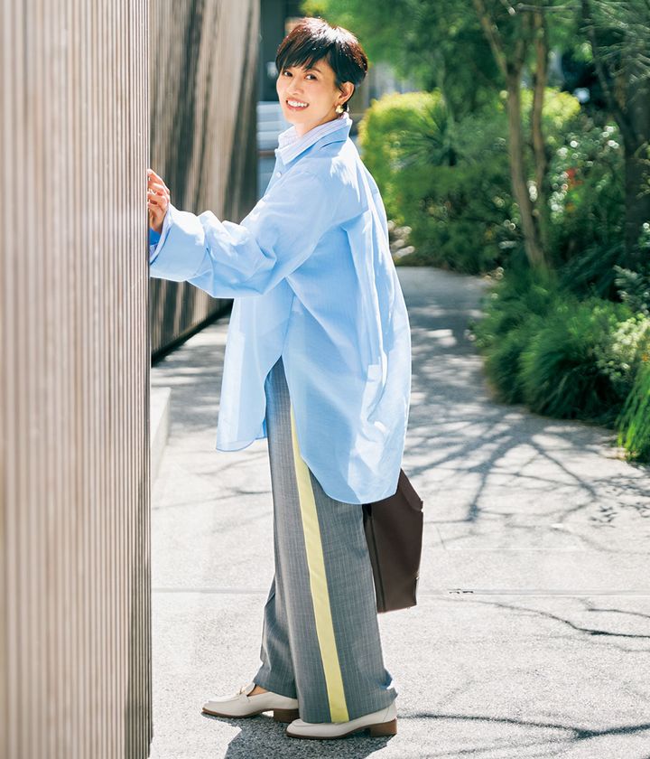 〝春に着たいきれい色は、大好きなブルーが気になっているところ。パンツ、シャツは無難になりがちですが、ラインパンツとシャツのレイヤードなら、新鮮な気持ちで着られそう!〟