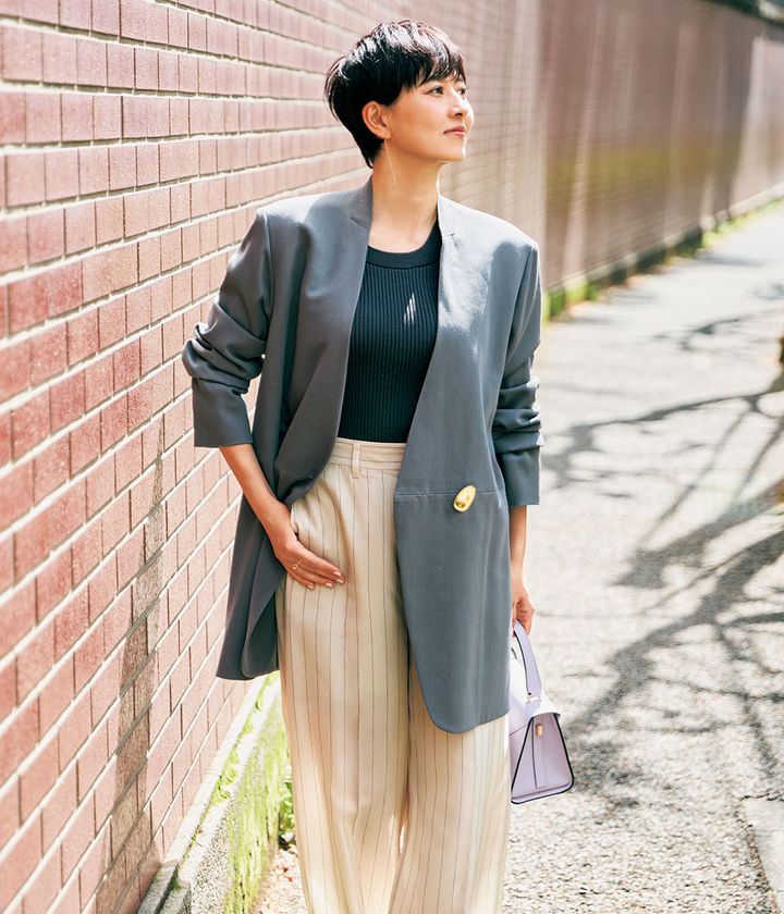 肩がしっかりと合ったジャケットにしかない、清潔感ときちんと感。今ならモードな印象も! ノーカラージャケット¥129,800(ハルノブムラタ/ザ・ウォール ショールーム)タンクトップ¥12,980(FRAY I.D/FRAY I.D ルミネ新宿2店)ストライプワイドパンツ 価格未定(ジャーナル スタンダード/ジャーナル スタンダード 自由が丘店)バッグ¥594,000(ヴァレクストラ/ヴァレクストラ ジャパン)リング[右手中指]¥148,500(マリハ)リング[右手薬指]¥28,600(K E I R./ロードス)