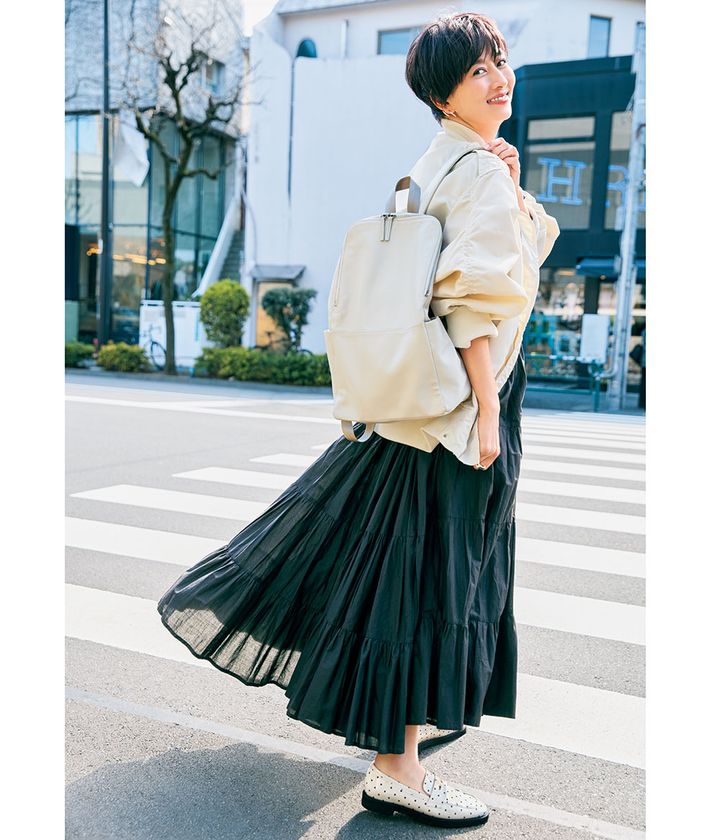 〝何にでもまず挑戦する。がモットーなので、最旬のパンツ×スカートの着こなしも気になります。チャレンジすることで、気持ちにも新しい風が吹きます!〟