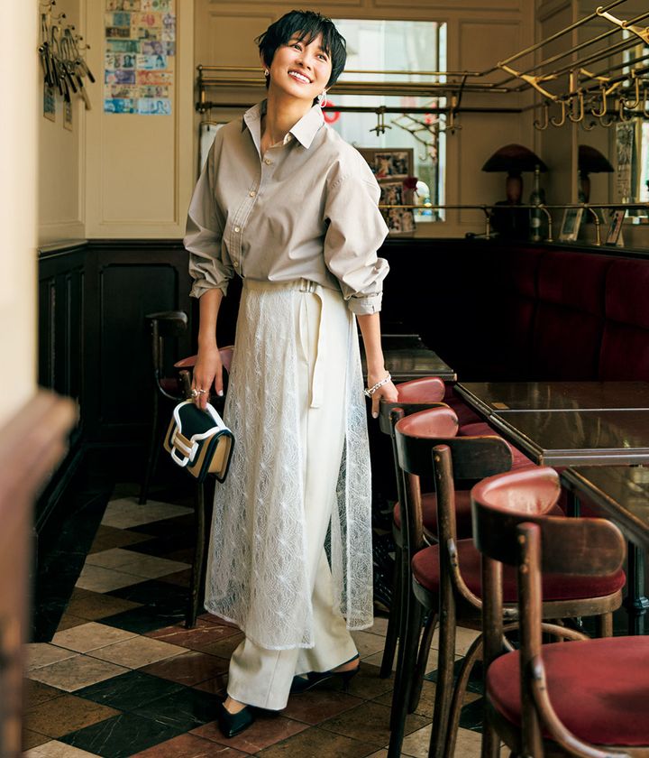 シックなベージュトーンをベースにしつつ、スカート、パンツのレイヤードで今どきに味つけ。シャツ¥17,600(ノーブル/ノーブル 有楽町マルイ店)レーススカート×パンツ[セット販売]¥13,200(スタイルミキサー)バッグ¥157,300(ピエール アルディ/ピエール アルディ 東京)パンプス¥66,000(ネブローニ)ピアス¥44,000(コンプリーテッド ワークス/デ・プレ)ブレスレット¥17,600(アドラル/ズットホリック)リング[右手人差し指]¥17,200(vihod/ロードス)リング[右手中指]¥50,600(プラウ)