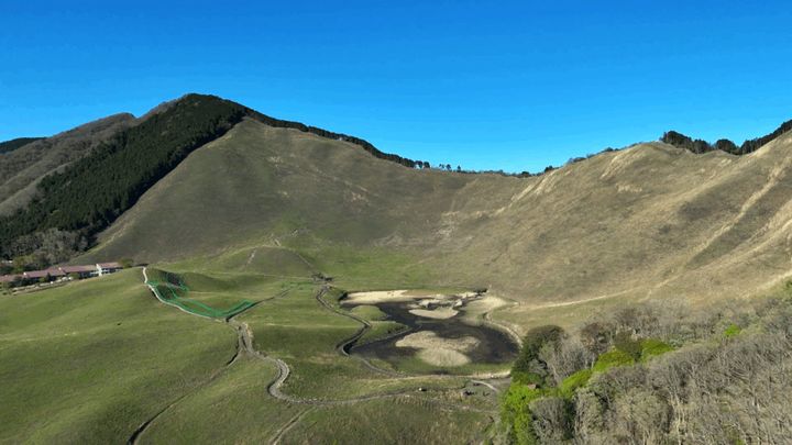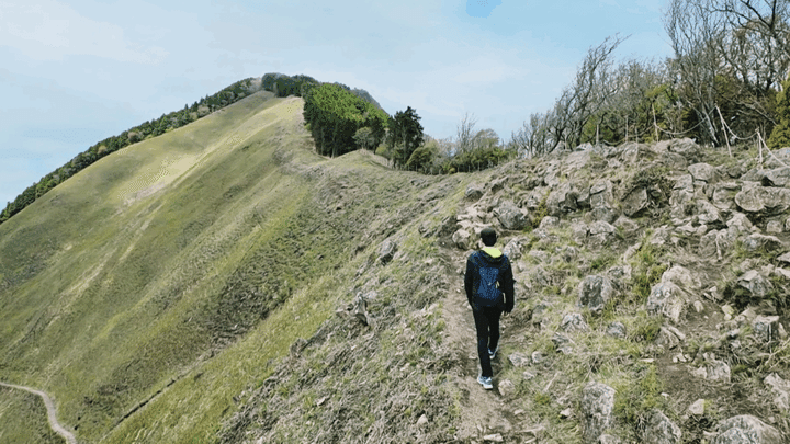 周囲には、およそ1500万年前の火山活動によって作られた山々があり、目指す倶留尊山はその中の最高峰。高原を横切っていよいよ登山道へ。前半は遮る木々もない、草原の道が山肌を縫うように続く。常に視界が開けているため来た道も行く道も見渡すことができ、景色を楽しみながら歩くことができる。