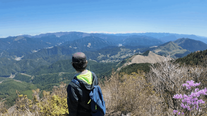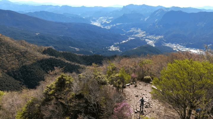しばらくすると登山道は稜線をたどるようになり、岩場をいくつか越えると林間へと続いてゆく。倶留尊山の山頂に至る手前で二本ボソという山頂(996m)にさしかかる。その先には、今回の撮影で一番の景色が眺められる場所があるらしい。ということで、寄り道をしてみることに。そこは、通称「イワシの口」と呼ばれる突き出た崖の上。なるほど!三重の街並み越しに遠く伊勢湾までも一望できる、そこはまさに絶景ポイント。