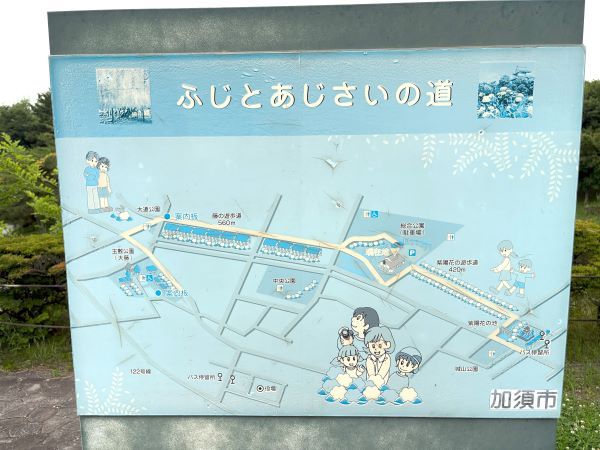 「ふじとあじさいの道」は、加須市の玉敷神社〜騎西総合公園〜騎西城までの全長約1.5kmの遊歩道。 その数約1万株ともいわれる色とりどりのあじさいが、見頃を迎えています。