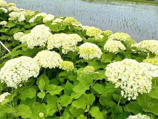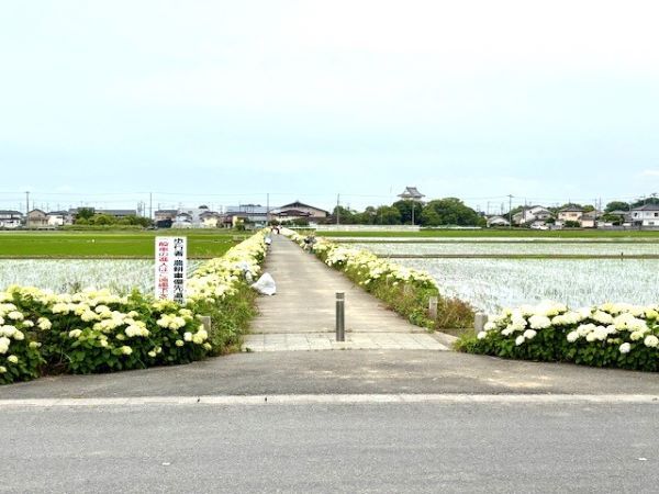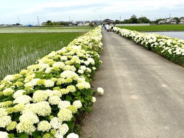 こちらはアナベルがメインのあじさいの道。大小のアナベルが咲き誇り、圧巻の眺め!右奥に見えるのが騎西城です。こちらも周りは田んぼなので吹き抜ける風が気持ちよく、空が高い!