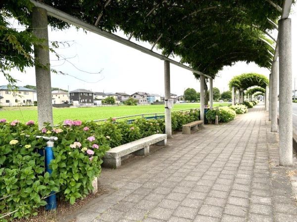 長く続く遊歩道なので、ベンチが等間隔にあるのは嬉しいですね。休憩しながら散策出来ます。ベンチの周りにもあじさいが咲いていて、癒されます♪周りは田んぼなので吹き抜ける風が気持ちいい~