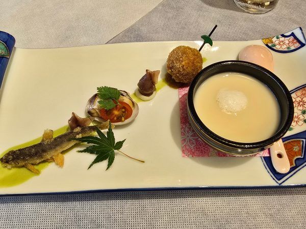 お料理は一皿にぎゅっと季節感が詰まっていて、まるでアートのよう。鮎の唐揚げ、貝とトマトの前菜、コロッケ、そして柏産かぶの冷製スープ。