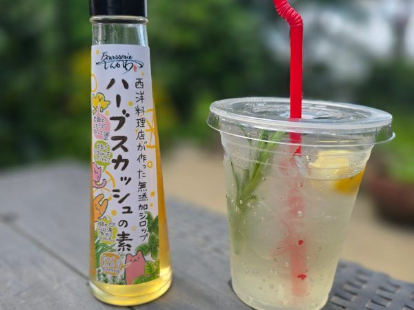 「西洋料理店が作った無添加シロップ」と書かれたボトルが印象的で、炭酸で割ると爽やかな香りと優しい甘さが広がります。西洋料理店がつくるこだわりの「ハーブスカッシュ」。