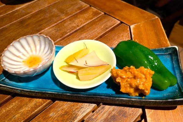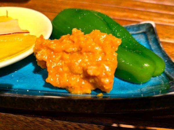 自家製の肉味噌がおいしいです。ご飯ススム系の肉味噌は新鮮なピーマンとの相性も抜群!野菜もおいしいのでパクパク食べてしまう前菜3種。