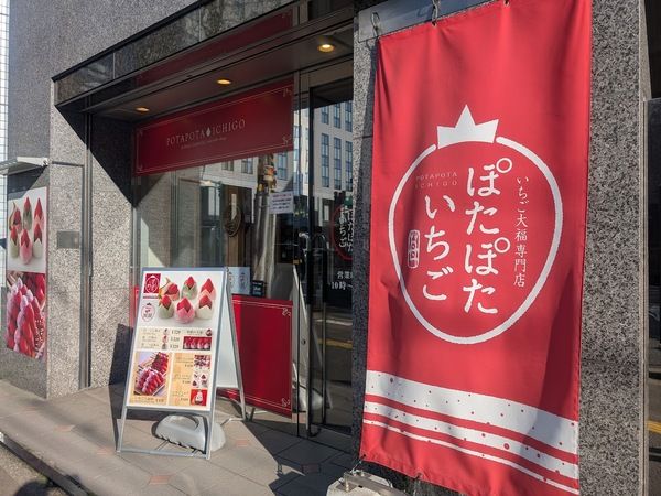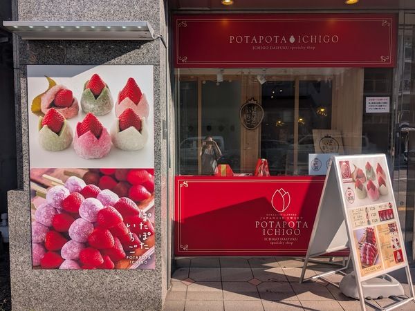 札幌駅北口から2分ほど歩き、角を曲がると突然目に飛び込んでくる赤いのれんといちご大福の写真!まわりはビルが多いので、とっても目立ちます。