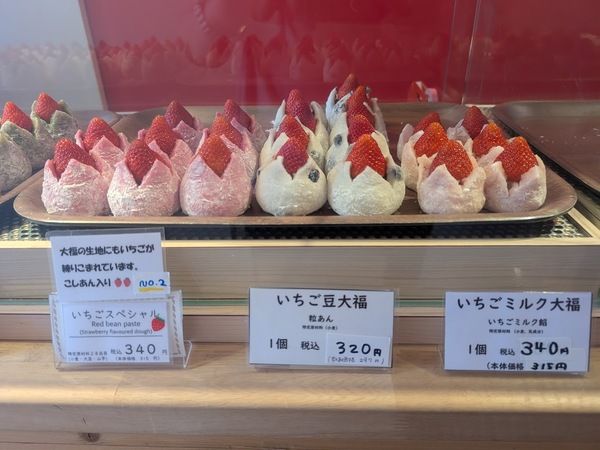 ショーケースにずらっと並ぶいちご大福たち!どれもおいしそうでなかなか選べず、お店の方におすすめを聞きながら、やっと決めることができたぐらいです。
