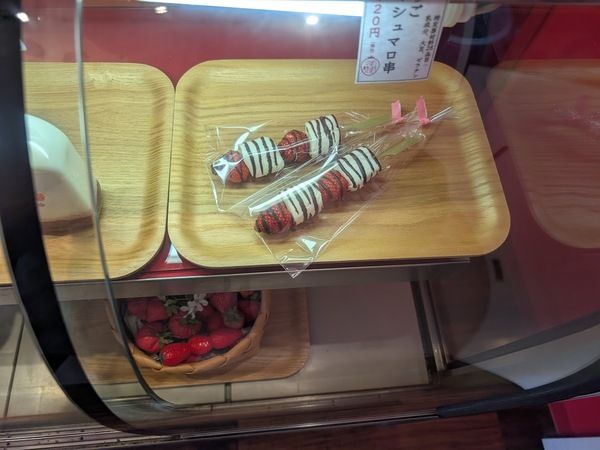 食べ歩きができるよう、『いちご大福串』も数種類用意されていましたよ。観光でいらっしゃった方にはこちらがおすすめです。