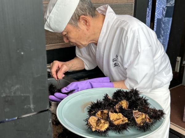 こちらは、店主のお父様が真剣にウニを捌いているところ! 繊細な作業です。お父様の声がまた素敵で、時々冗談を言いながらのお客さんとの掛け合いも、「松葉寿司」さんの活気の一つになっています。