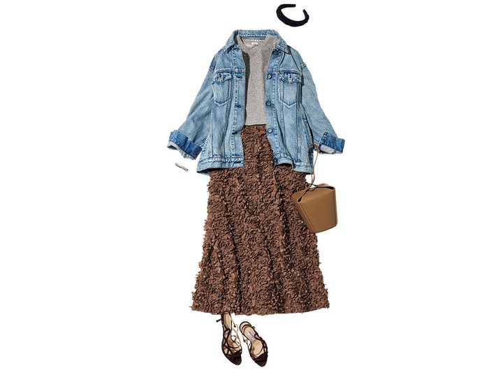 スカート¥58,300(ゲミニー/ウィム ガゼット 玉川髙島屋S・C店)Tシャツ¥17,600(シー/エスストア)バッグ¥37,400(ヴァジック/ヴァジックジャパン)サンダル¥86,900(ネブローニ)カチューシャ¥39,600(ソフィー ブハイ/エスケーパーズオンライン)ブレスレット¥27,500(アビステ)