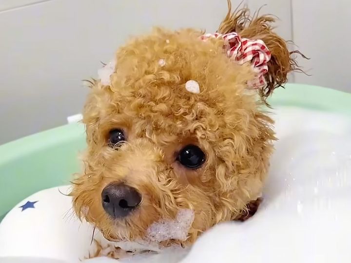 クマ耳キャップも似合ってる! トイプーさんのリラックスバスタイム
