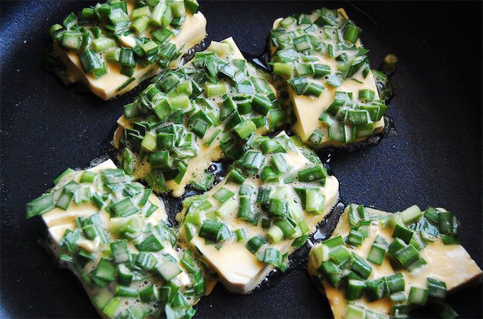 ニラ玉衣が豆腐にうまくつかなくても、豆腐の上にのせればOK。