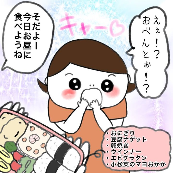 娘にお弁当を作ったときのエピソードを描いた漫画「2歳児にとってのお弁当」が、インスタグラムで300以上の「いいね」を集めて話題となっています。 自宅保育している2歳の娘に、母がお弁当を作ってあげました。「お昼になったら食べようね」と言うと、娘は大喜び。肌身離さずお弁当を持って歩く娘の様子を見て、「食べるときが楽しみだな」とワクワクしていた母でしたが…。読者からは、「お弁当って特別感があってうれしいですよね!」「予想外のオチに爆笑(笑)」「うちの娘にも作ってあげよっと」などの声が上がっています。