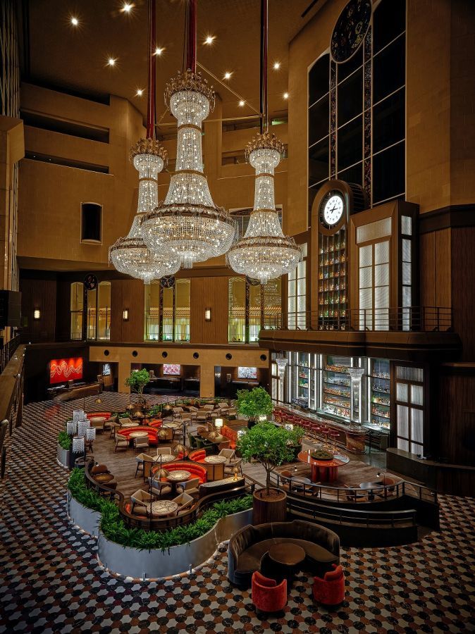 まず目に飛び込んでくるのは8階分に相当する高さ28mの開放的な吹き抜け空間と、豪奢な3基のシャンデリア。約11万5000個のスワロフスキー®・クリスタルが使用されたこのシャンデリアは、華やかでエレガントな光を放つホテルのシンボルとして、存在感があります。ちなみに店名の「Nineteen Eighty」はホテルの開業年であり、象徴的なシャンデリアが設置された1980年という記念すべき年に由来しています。