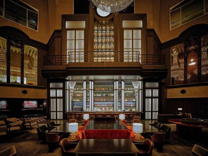 バーの上部には、ニューヨークのグランド・セントラル駅にある大型時計からインスピレーションを受けデザインされたという時計が設置。さらにホテル最寄りの現在の新宿駅にある大時計も彷彿とさせ、空間全体に奥行きとクラシカルなムードをプラスします。