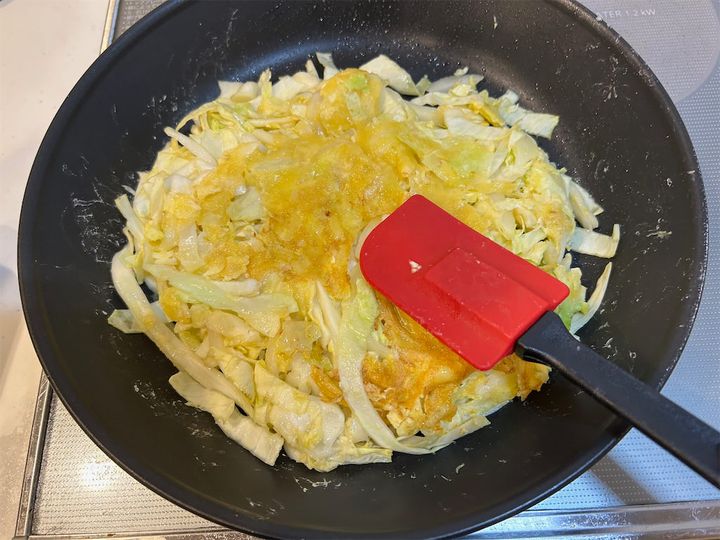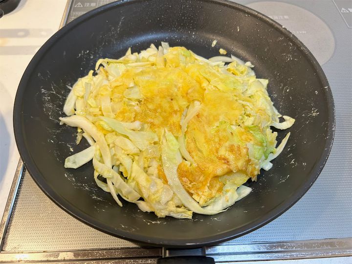 このようにまんべんなく混ざったら、後はフライパンで焼くだけです!