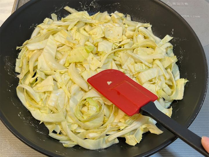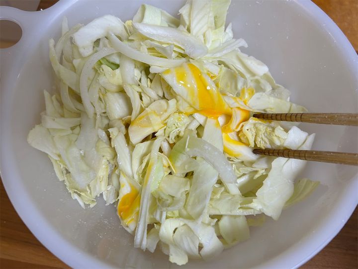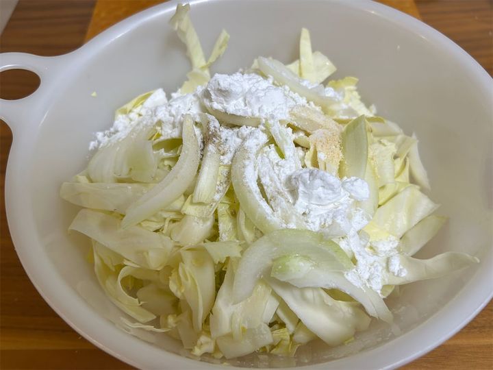 3. 2のキャベツと玉ねぎに、片栗粉、鶏ガラスープの素、塩、こしょうを加えます。