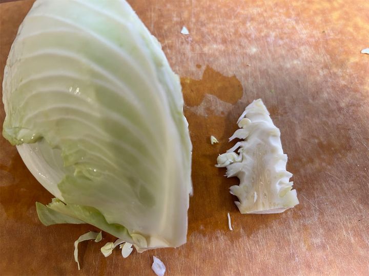 1. キャベツの表面を水洗いして水気をふきとり、芯を切り落とします。