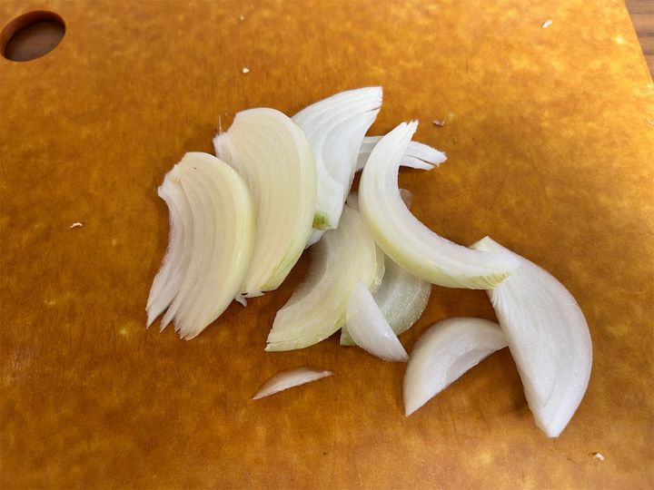 2. 次に、玉ねぎをスライスしていきます。5mm幅程度に切りました。