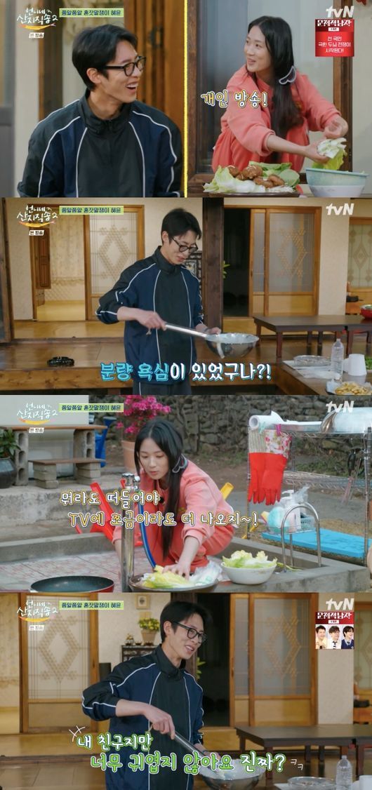 夕食の準備中も、彼女のおしゃべりは止まらず。野菜を洗いながら何かをつぶやくキム・ヘユンに、イ・ジェウクが「今なに話してるの? 誰と喋ってるの?」と問いかけると、彼女は「なにか話してたほうがテレビに映る確率が上がるじゃない」と率直に答えて笑いを誘った。